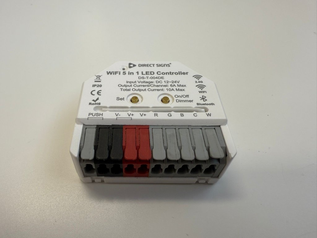 WIFI kontroler Direct Signs 5v1 na 12-54V a maximální zátěží 5A na každý výstup. Na kontroler lze použít jakýkoli typ LED pásku, krom digitálních. Ovládat jej lze přes aplikaci TUYA, dálkové ovládání RGBCCT Direct Signs a nebo přes úplně nový RF Smart Knob. Tento kontroler nepotřebuje pro jeho použití s mobilním telefonem či tabletem žádný specifický bridge, pouze standardní WIFI router. Jeho použití je jednoduché a intuitivní.